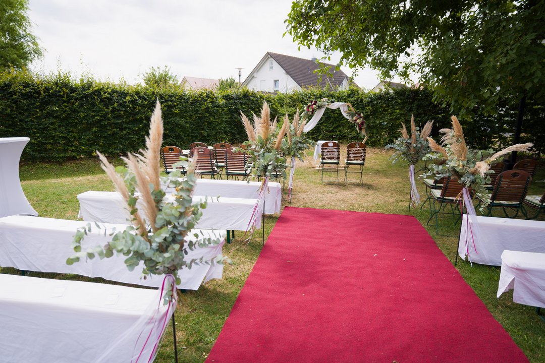Für freie Trauungen bietet der Landgasthof Adler mehrere Möglichkeiten. Bei schönem Wetter kann die freie Trauung im Garten im hinteren Bereich der Location stattfinden – ruhig gelegen und abgeschirmt vom restlichen Geschehen. Sollte das Wetter nicht mitspielen oder es kälter sein, besteht die Möglichkeit, die freie Trauung im Inneren auf einer Galerie abzuhalten. Diese Alternative schafft eine sehr intime, besondere Atmosphäre und bietet zugleich Planungssicherheit.