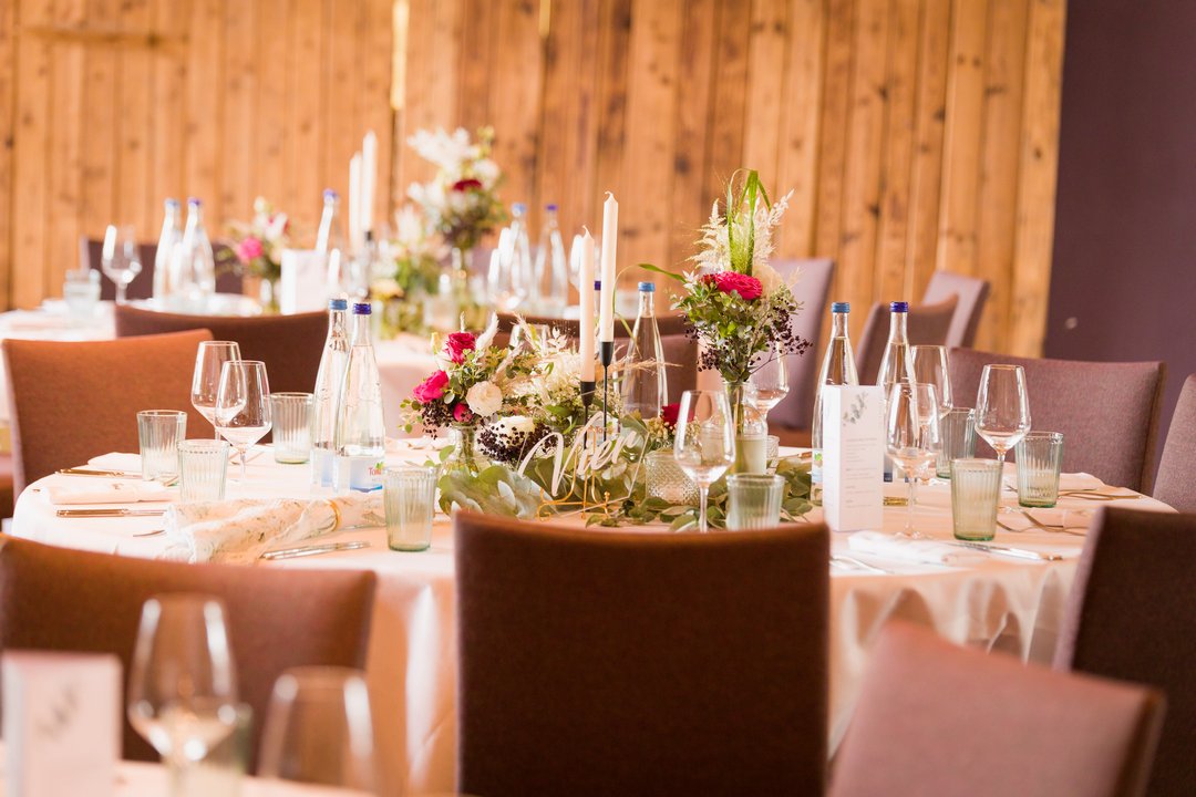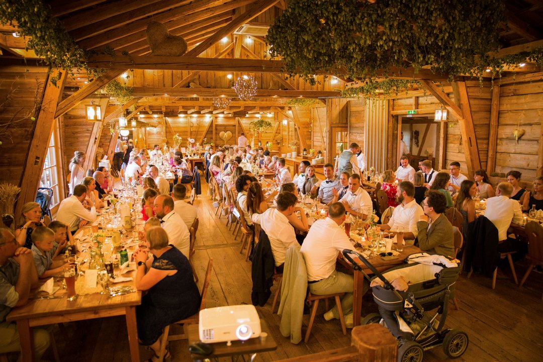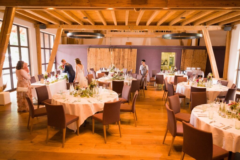 Der liebevoll gestaltete Saal beeindruckt vor allem durch seine hohe Raumhöhe, die dem Raum Weite und Großzügigkeit verleiht. Sichtbare Holzelemente, natürliche Materialien und eine durchdachte Gestaltung schaffen ein Ambiente, das rustikal wirkt, dabei aber stets elegant und hochwertig bleibt. Der Saal bietet ausreichend Platz für festlich gedeckte Tische, eine Tanzfläche sowie musikalische Begleitung durch DJ oder Band.