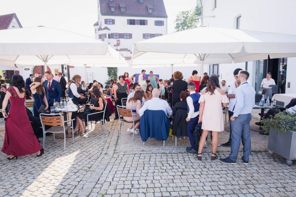 Bereits vor der Feier bietet der schön gestaltete Vorplatz ideale Möglichkeiten für den Sektempfang, lockere Gespräche oder kleine Programmpunkte. Dieser Außenbereich wird von vielen Paaren gerne genutzt, um ihre Gäste entspannt willkommen zu heißen und den Übergang zwischen Ankunft und Feier fließend zu gestalten. Besonders bei gutem Wetter entsteht hier schnell eine angenehme, gesellige Stimmung.
