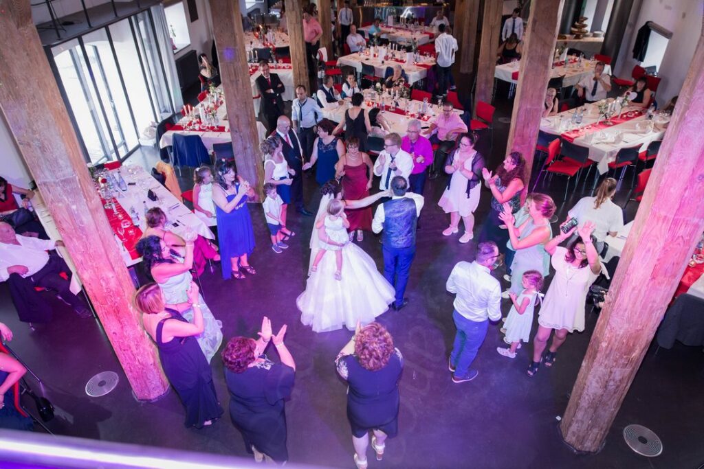 Besonders praktisch ist die zweite Ebene in Form eines umlaufenden Balkons, die zusätzliche Nutzungsmöglichkeiten bietet. Dieser Bereich eignet sich ideal für eine Fotobox, ein Gästebuch oder kleine Rückzugsorte, ohne den Hauptbereich der Feier zu stören. Gleichzeitig bleibt der Raum offen und verbunden, was das Gemeinschaftsgefühl unter den Gästen stärkt.