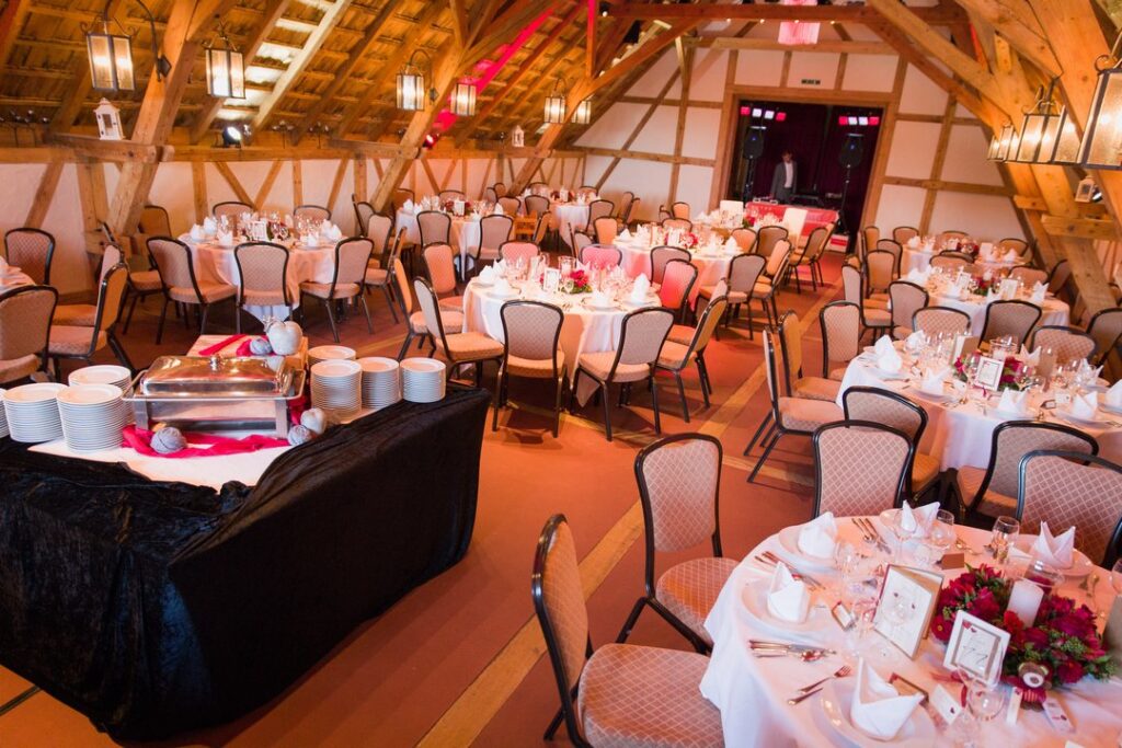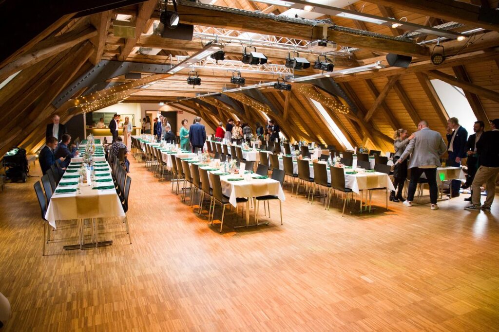Der eigentliche Veranstaltungsraum befindet sich im Obergeschoss des Zehntstadels und verbindet auf eindrucksvolle Weise Tradition und Gemütlichkeit. Der rustikale Look mit sichtbarem Holzgebälk verleiht dem Raum Wärme und Charakter, während die Raumhöhe und Struktur für eine angenehme Großzügigkeit sorgen. Hier entsteht eine Atmosphäre, die sowohl festlich als auch ungezwungen wirkt.