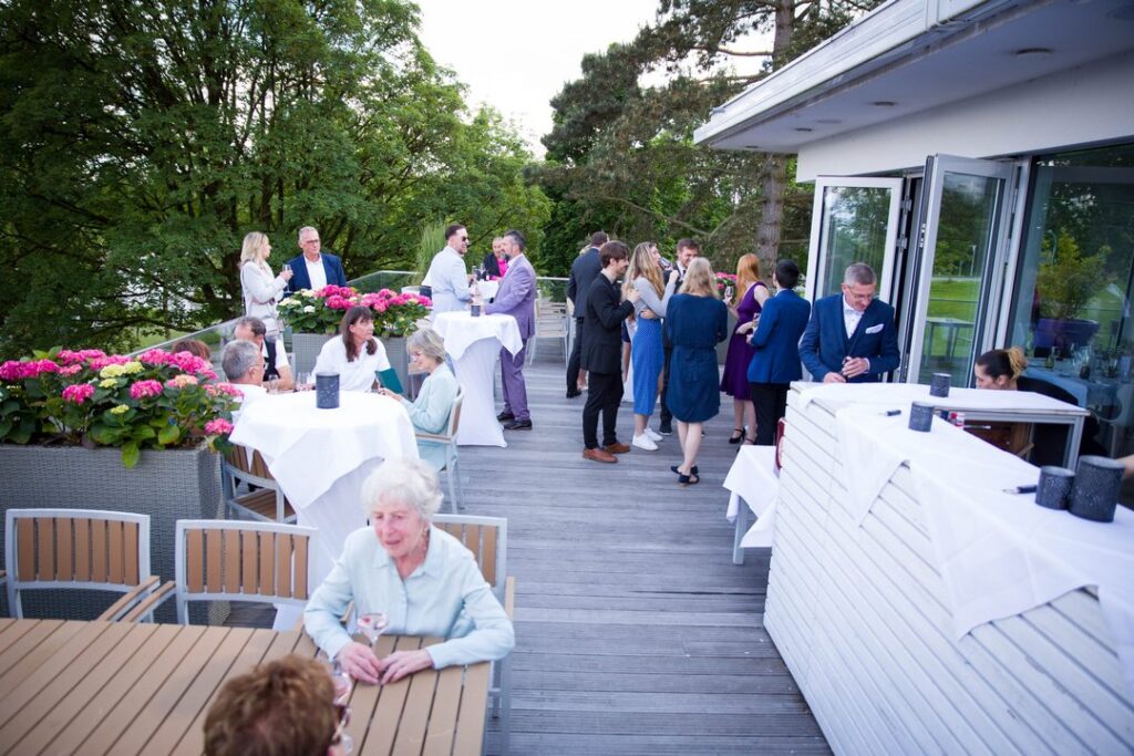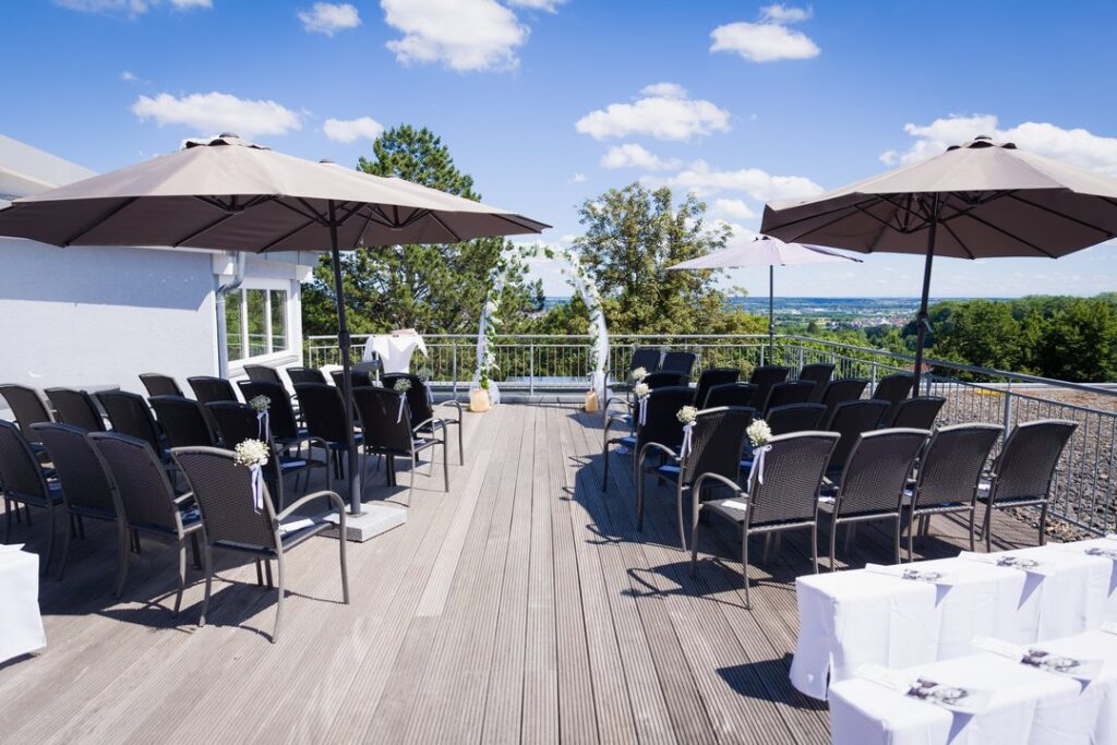 Direkt vor und seitlich des Saals befinden sich großzügige Terrassenbereiche, die mit stilvollen Lounge-Möbeln ausgestattet sind. Diese Außenflächen werden gerne für den Sektempfang, entspannte Gespräche oder kurze Pausen während der Feier genutzt. Der fließende Übergang zwischen Innen- und Außenbereich sorgt dafür, dass sich Gäste frei bewegen können und der Hochzeitstag sehr ungezwungen verläuft.