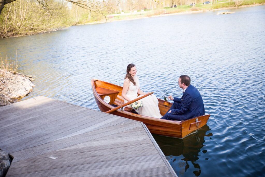 Ein echtes Alleinstellungsmerkmal ist der wunderschöne Außenbereich direkt am See. Hier lassen sich Sektempfang, entspannte Gespräche oder kleine Programmpunkte in einmaliger Kulisse umsetzen. Besonders charmant ist die Möglichkeit, mit einem kleinen Boot auf den See hinauszupaddeln – ein außergewöhnlicher Moment, der sich perfekt für romantische Paarfotos eignet und der Hochzeit eine ganz persönliche Note verleiht.