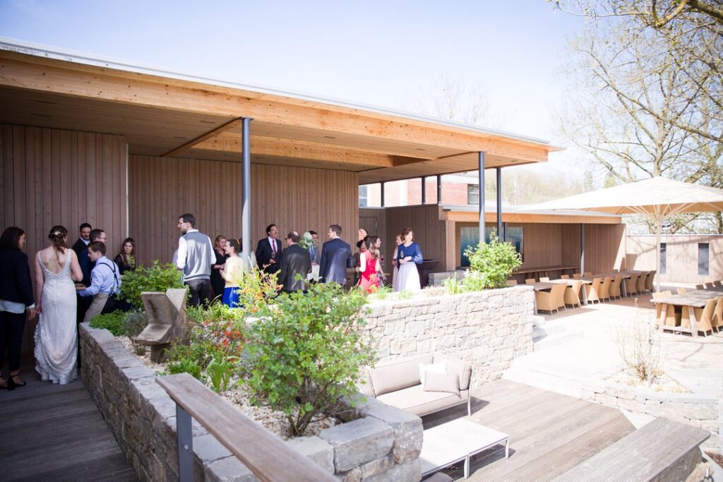 Direkt vor dem Saal befindet sich ein großzügiger Aufenthaltsbereich mit Tischen und Bänken, der sich hervorragend für den Sektempfang, entspannte Gespräche oder eine kleine Pause zwischendurch eignet. Diese Fläche wird von vielen Paaren gerne genutzt, um den Übergang zwischen Innen- und Außenbereich fließend zu gestalten.