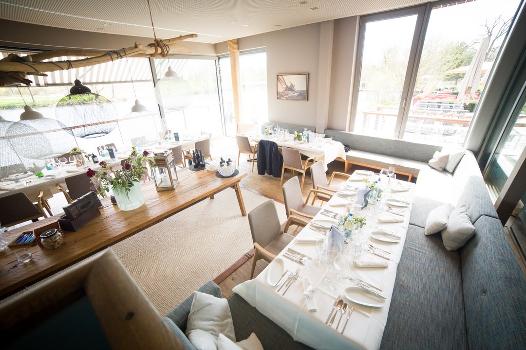 Im Mittelpunkt steht der große, helle Saal, der durch viele bodentiefe Fenster geprägt ist. Sie sorgen für eine offene, freundliche Atmosphäre und lassen reichlich Tageslicht in den Raum. Dadurch wirkt der Saal zu jeder Tageszeit angenehm hell und großzügig. Auch fotografisch bietet der Raum ideale Voraussetzungen – sowohl für emotionale Momente während des Essens als auch für lebendige Aufnahmen später am Abend.