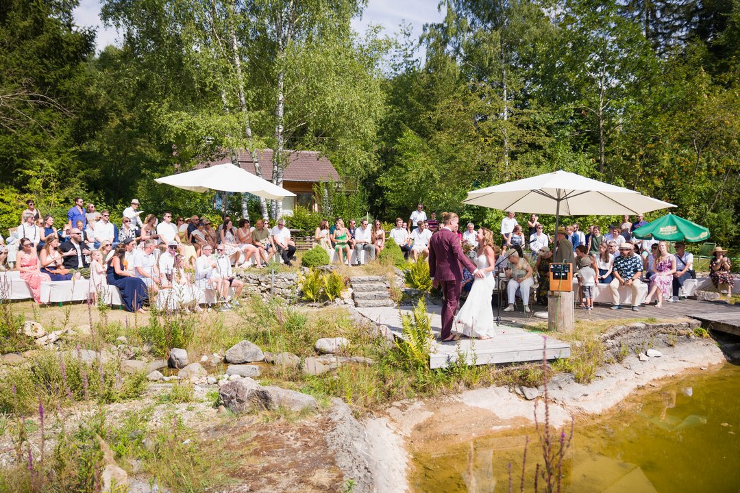 Ein besonderes Highlight ist die Möglichkeit zur freien Trauung am anliegenden Weiher. Die natürliche Kulisse aus Wasser, Wiesen und Bäumen schafft eine sehr persönliche und emotionale Atmosphäre für Zeremonien unter freiem Himmel. Gerade für Paare, die sich eine ungezwungene, individuelle Trauung wünschen, ist dieser Ort ideal – und auch fotografisch ein echtes Highlight.