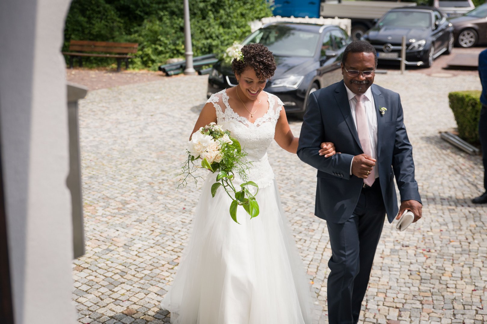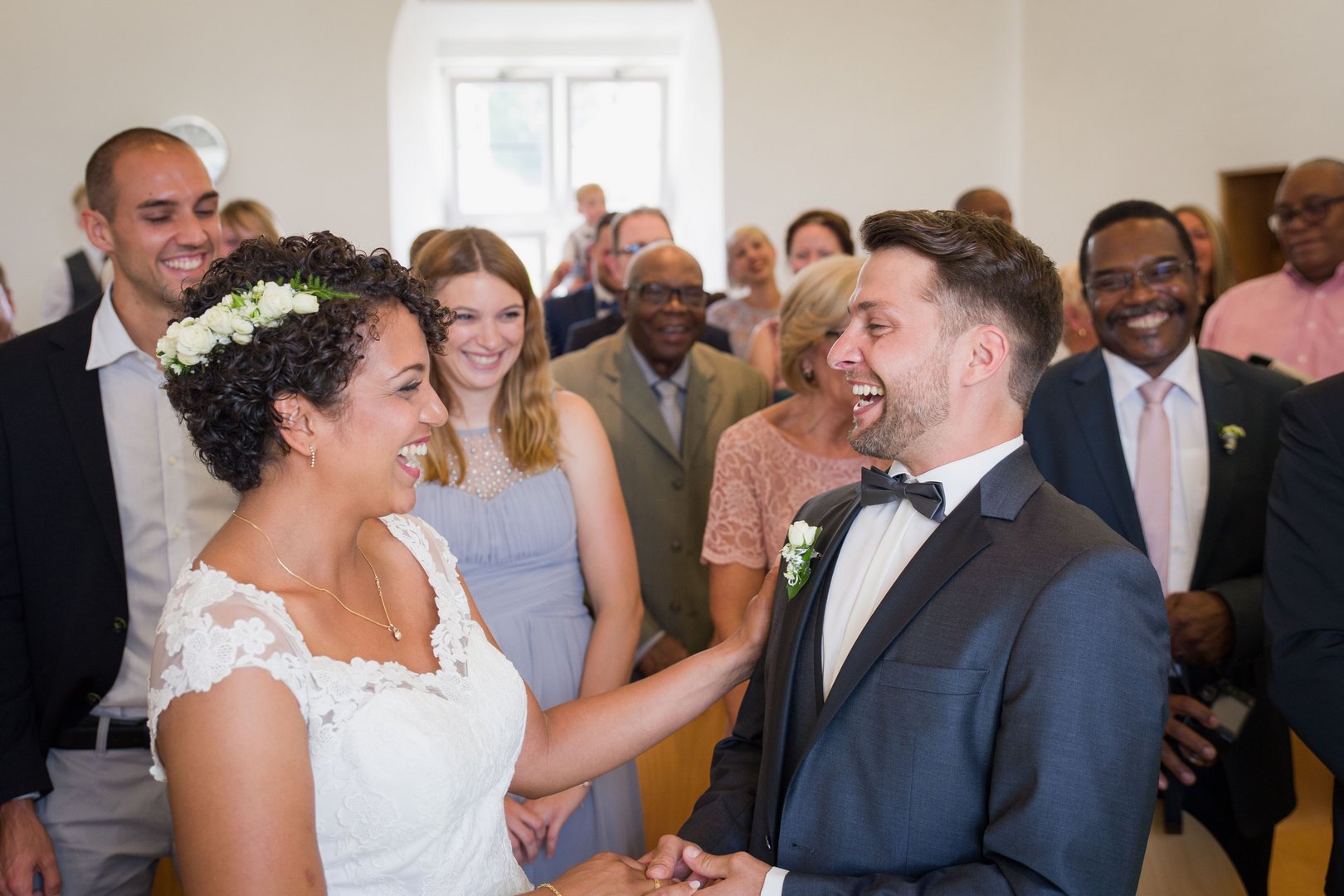 lachende Braut beim Fotoshooting im Kloster Oberelchingen
